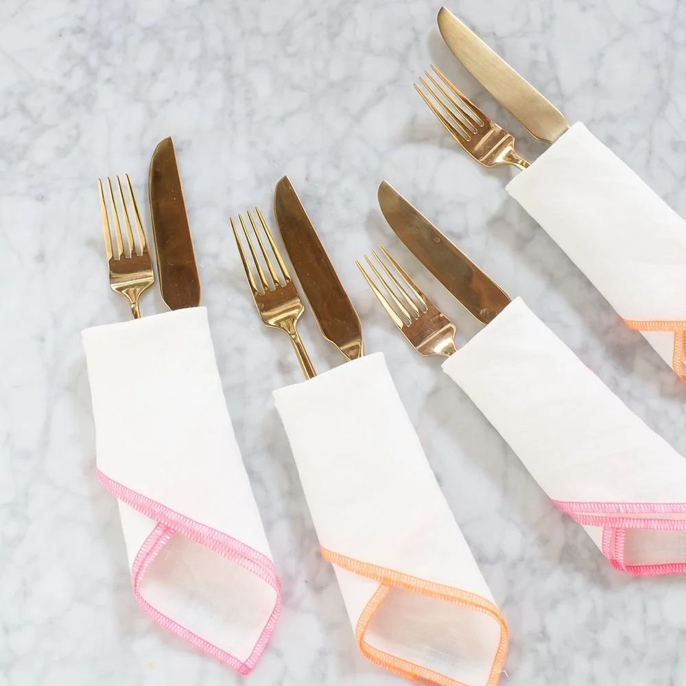 We are so so excited to share that we have four exclusive napkins sets with the new Oh Joy! shop! Blogger and entrepreneur, Joy Cho (with product in Target and collaborations with Band-aid, Calpak, Maptote, and many more design focused brands—no biggie!), has designed 4 simple, fun, colorful Everyday napkin sets with our fabrics and edge colors—two Signature napkins sets and two Dinner napkins sets.